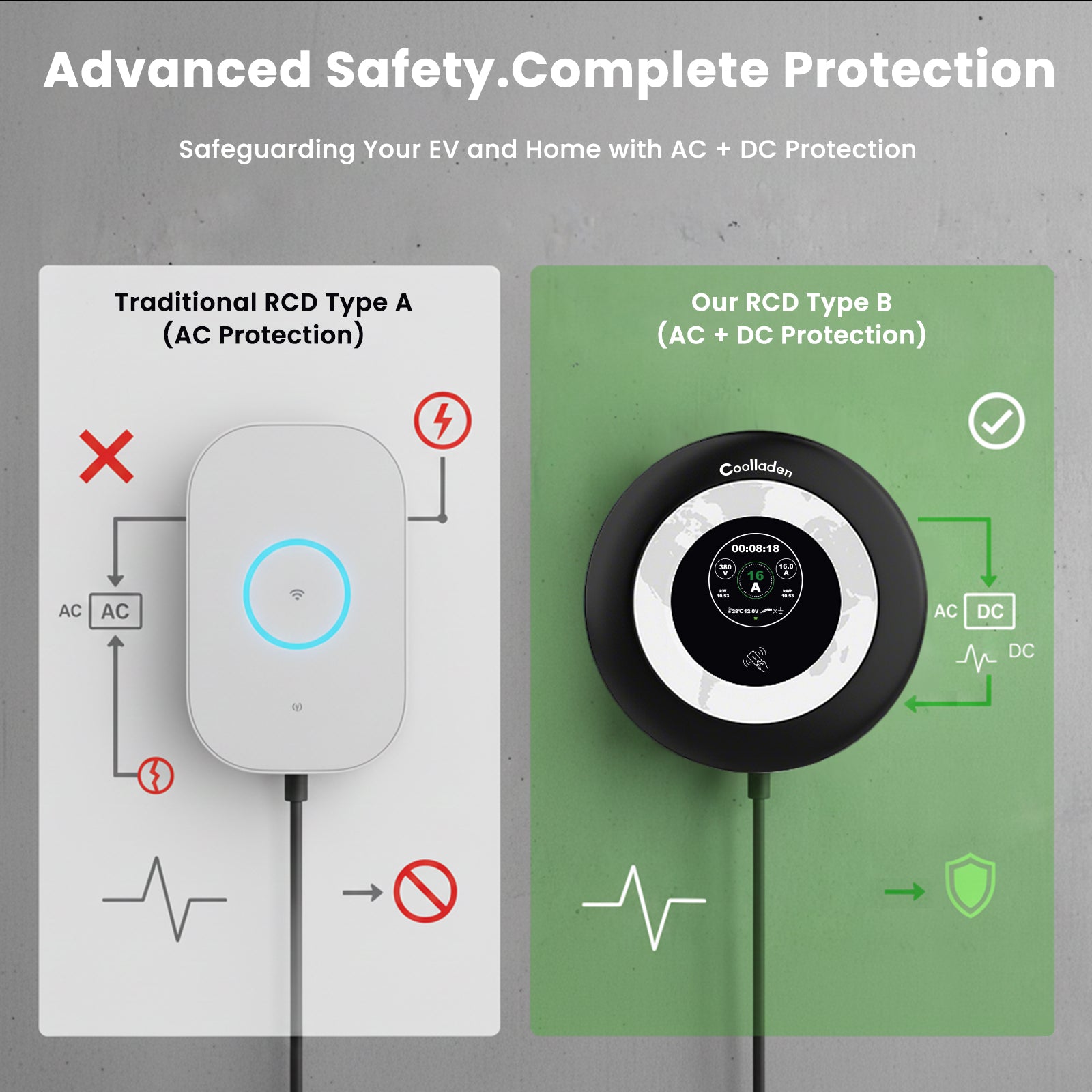 Sikkerhed er fundamentet i Coolladen-oplevelsen. Fuldt CE- og RoHS-certificeret, vores wallbox har en indbygget RCD Type B-sensor (AC 30mA + DC 6mA).